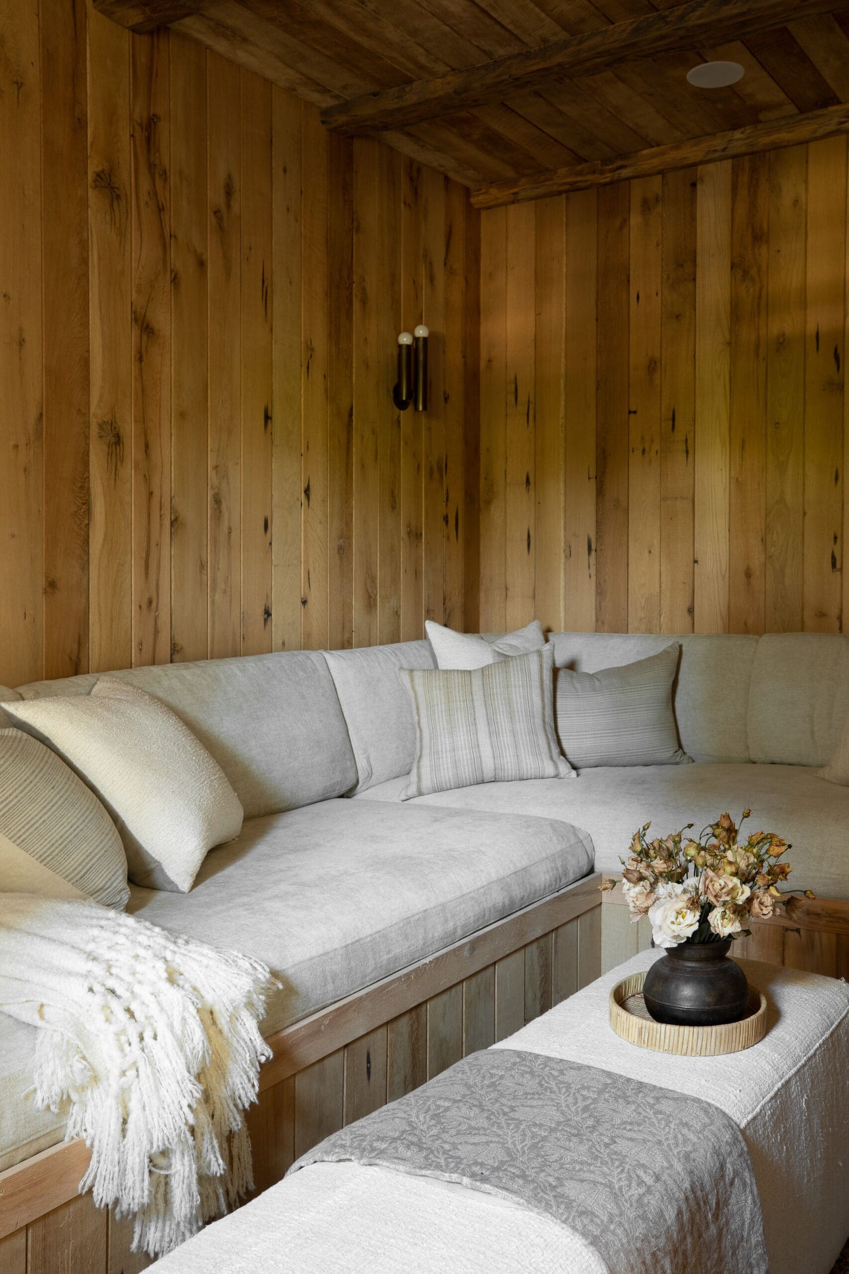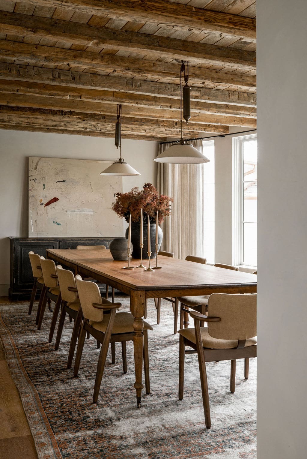 The stone fireplace grounds the space in earthy comfort; a brick backsplash adds texture and story. Natural materials abound. Weathered woods, soft layered textiles, tactile stone, and yet the scale feels grand. It’s spacious without losing intimacy; opulent without feeling showy. What I love most is how every layered texture (wool rugs, woven fabrics, raw hewn wood) invites you to slow down and stay awhile. This is the kind of home that reminds me why natural materials and warm design are forever relevant!