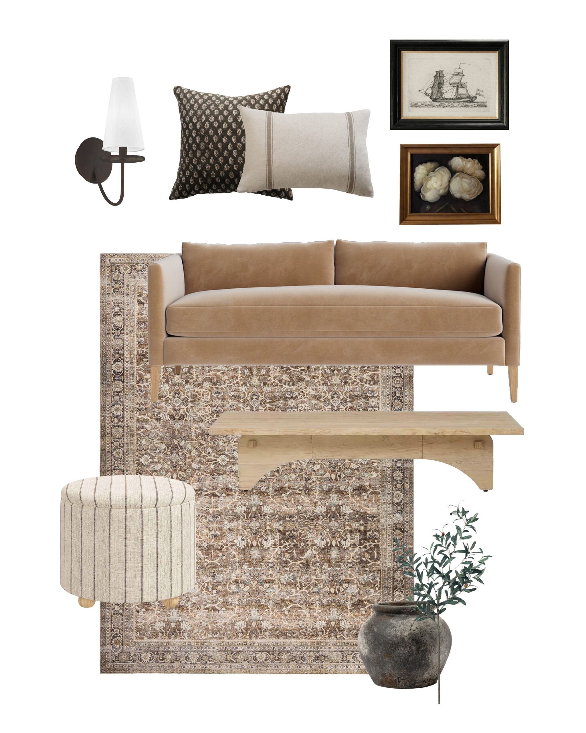 Wall Sconce | Floral Pillow | Stripe Pillow | Vintage Boat Print | Botanical Art Print | Printed Rug | Velvet Sofa | Coffee Table | Striped Storage Ottoman | Aged Terracotta Jar | Faux Olive Branch