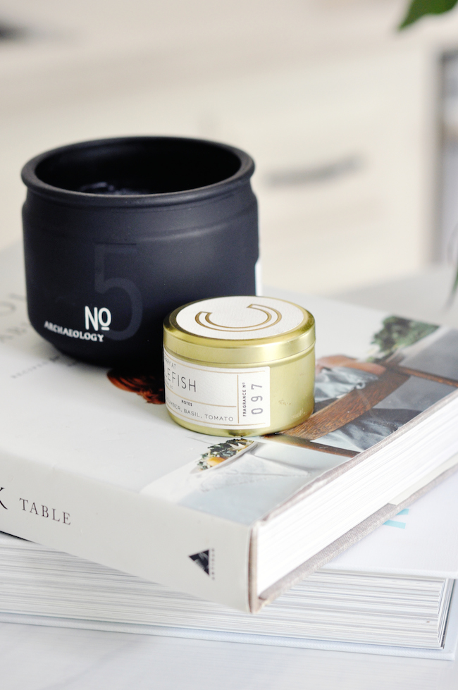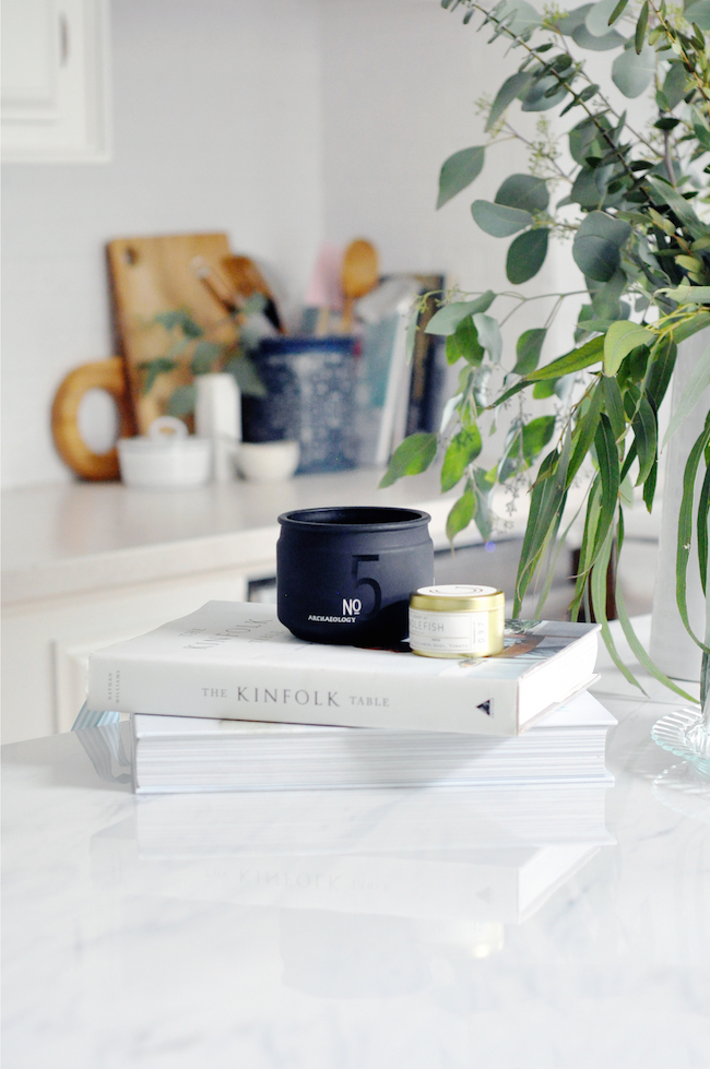 Sources: Wall Colour: BEHR® MARQUEE® – Quiet on the Set | Backsplash Colour: BEHR® PR-W14 – Bit of Sugar | Door Colour: BEHR® MARQUEE® – Limousine Leather | Island: Similar Here | Track Light: Wayfair | Kinfolk Cookbook: Food52 | Tomato Basil Candle: Anthropologie | Navy Tea Towel: Anthropologie | Grey Tea Towel: Pamuk & Co. | What Katie Ate Cookbook: The Cross | Pitcher: Pottery Barn | Fruit Bowl: Pottery Barn | Wicker Basket: Pottery Barn | Silver Basket: West Elm | Salt Cellar: Hawkins | Sugar Bowl: Anthropologie | Honeysuckle Soap & Lotion: Anthropologie