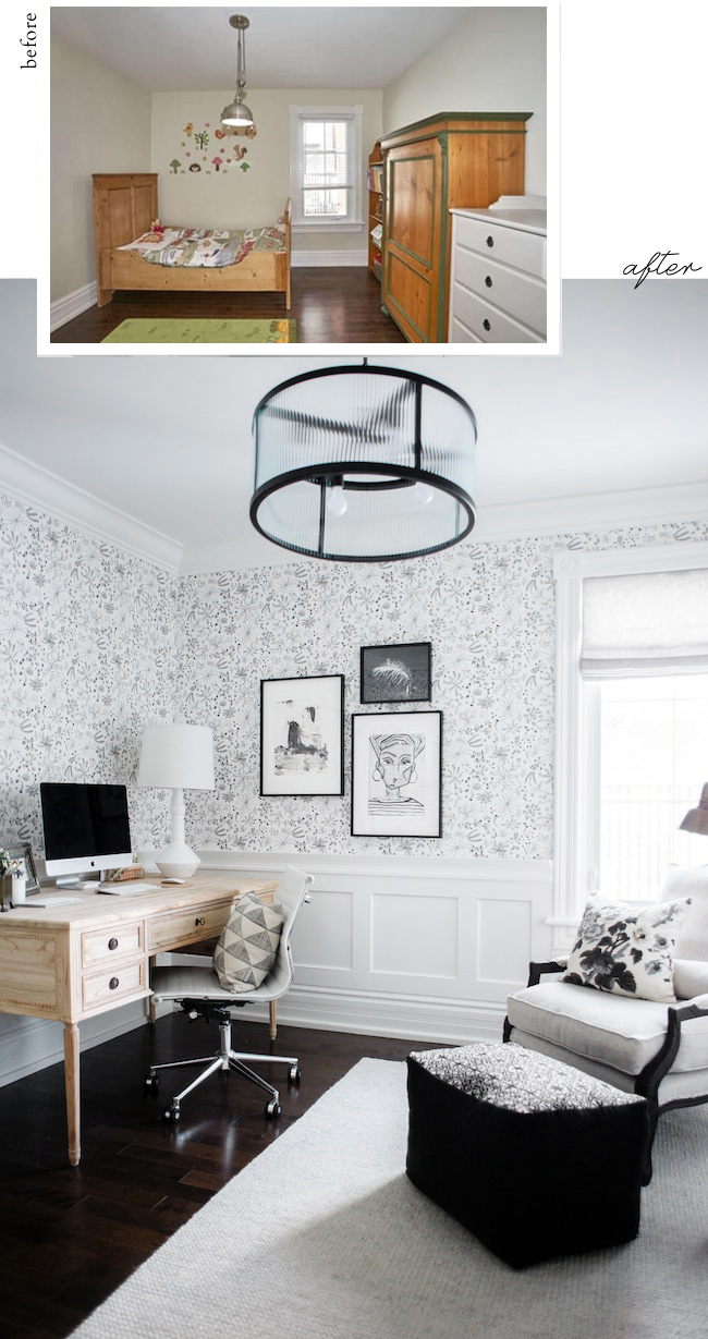 This is an amazing before/after. I can’t get over the paneling. It totally makes the room. And while I really like your wallpaper, it would be just too much floor-to-ceiling. That band of white around the bottom of the room calms it down. And it’s so classy.