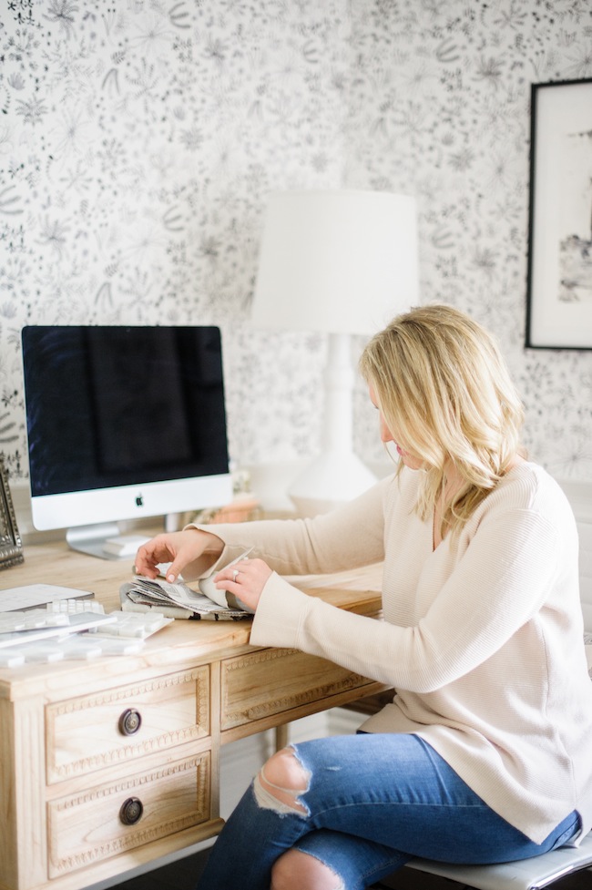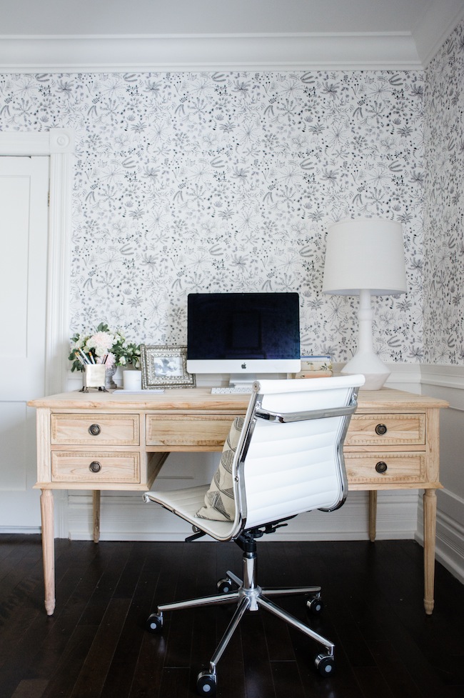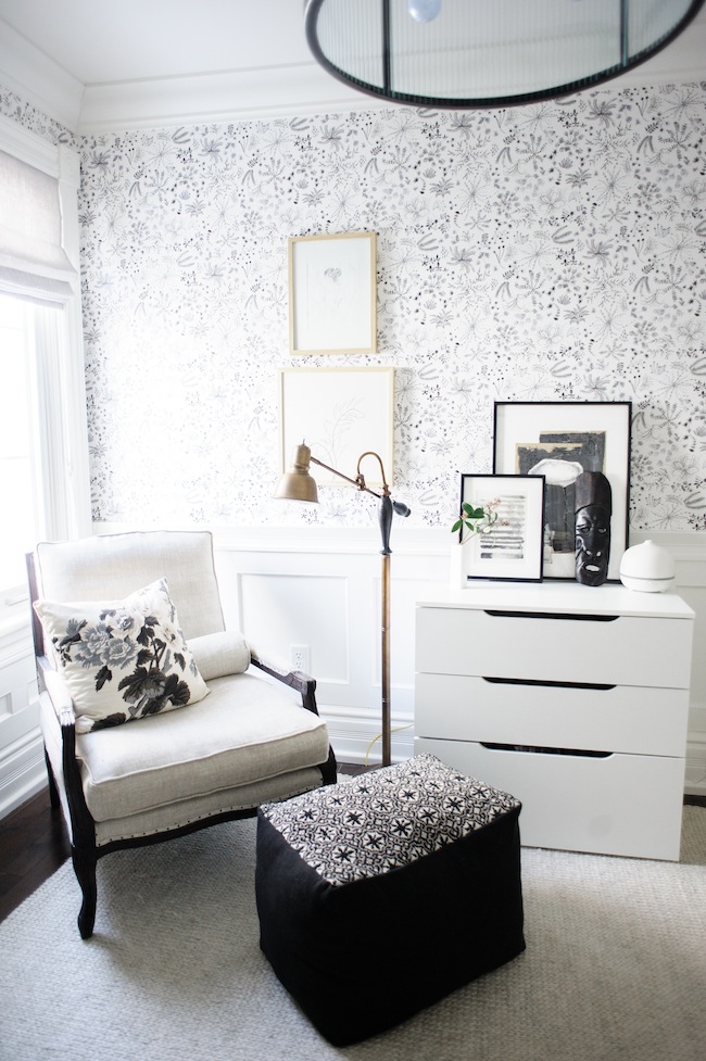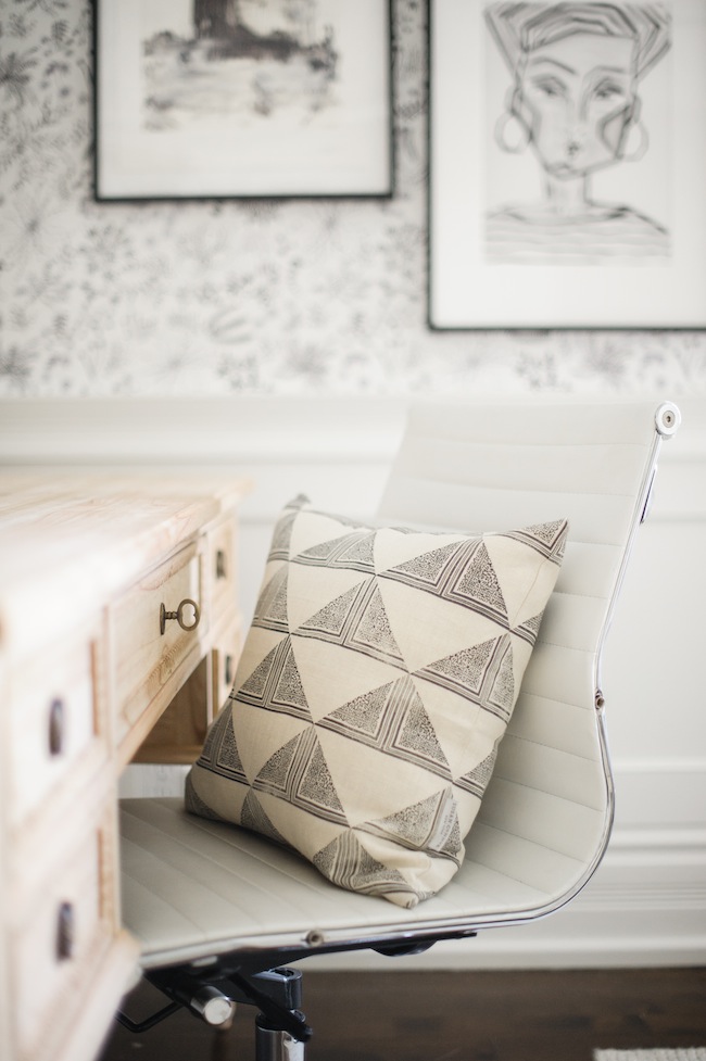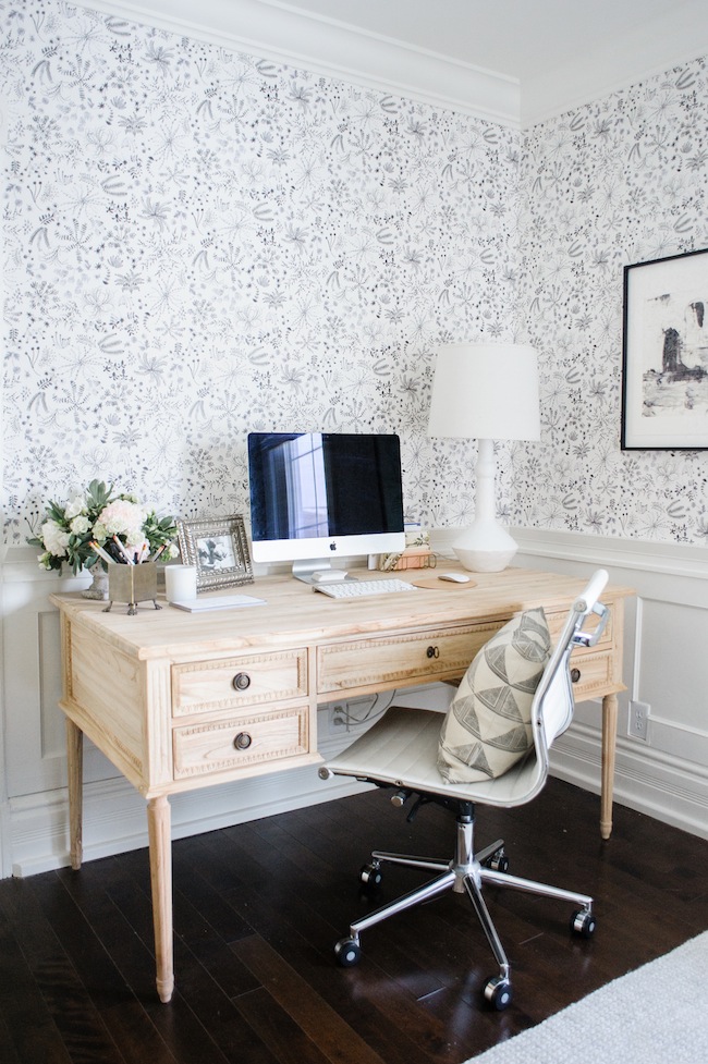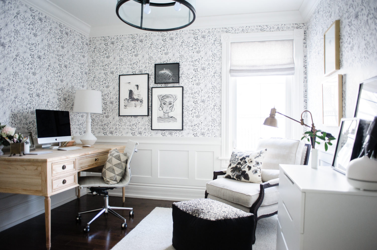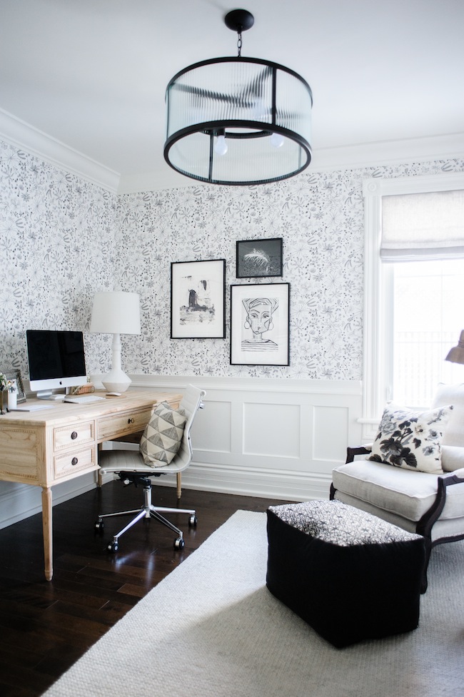 Wallpaper: c/o Anthropologie | Desk: c/o Ave Home | Side Chair: c/o Plaidfox | Area Rug: c/o Armadillo & Co | Custom Roman Shade: c/o Tonic Living | Filing Cabinet: Wayfair | Bookshelf: Ikea | Desk Lamp: Serena & Lily | Pendant: Joss & Main | Floor Lamp: Vintage | Floor Poof: c/o Métis | Light Switches: c/o Legrand | Desk Chair: Wayfair