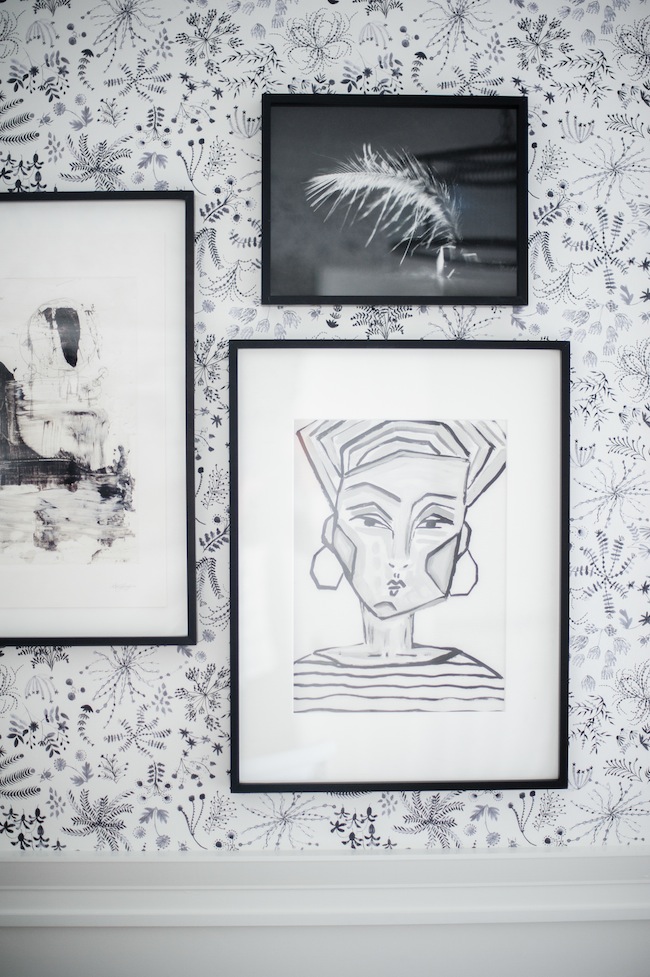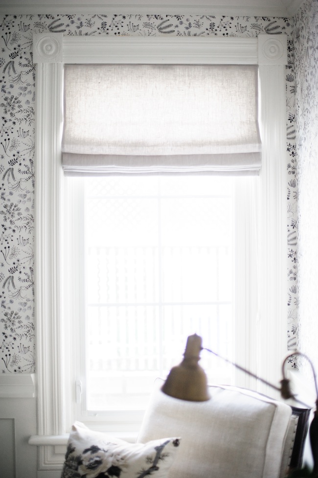 While Justin and his dad handled the wall demo and rebuild portion of the whole ordeal, we worked with True Contractors (one of my favourite construction companies in the GTA) when it came to finishing details. They installed some beautiful wainscotting, and 6″ crown moulding, all from Metrie. It was only about two days worth of work, and the finishing details absolutely, hands down, no question, made the space what it is. The wainscotting is installed 3′ up the wall, and the rest is finished with a bold black, white, and grey wallpaper from Anthropologie. We installed sleek, soft tap, dimmable light switches (which I LOVE). A custom roman shade from Tonic Living, in Tuscany Linen – Prism, topped it all off, and with that we were off to the races.