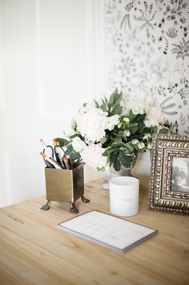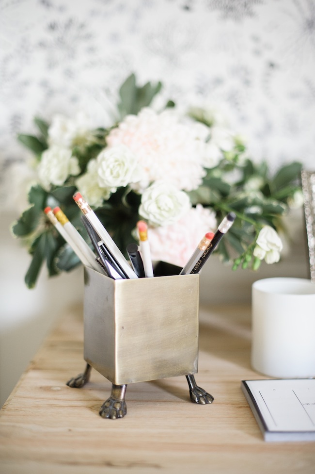 Your office is so perfect! I love it. It’s so bright and cherry and I love the wallpaper. Eyeing that pencil cup and OMG the little feet on it are so cute!!