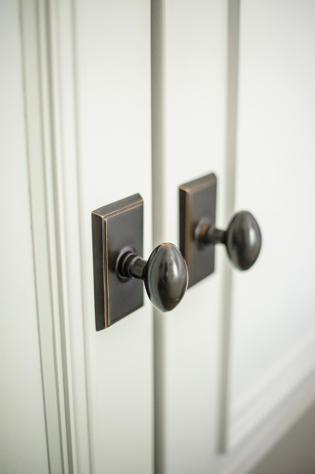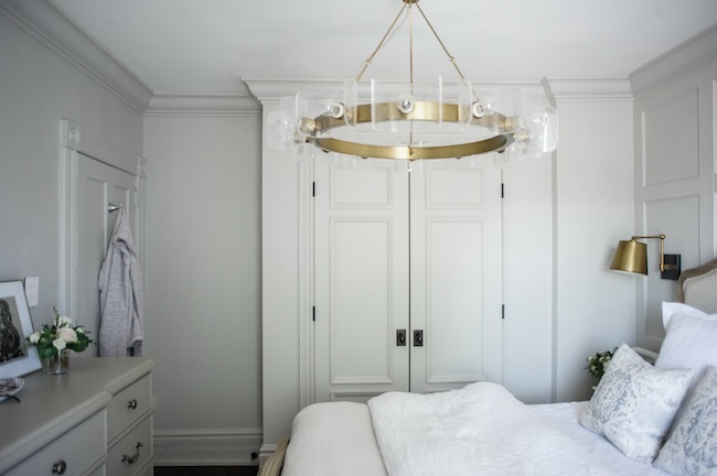 While our home is not large by any stretch of the imagination, I like to tell myself that it makes up for its size in style and character. And we made sure to up the ante in that regard while we were constructing the aforementioned closet. Adding wall to wall panelling in a simple grid configuration behind our bed instantly added a design layer, and a focal point, that you just can’t beat. Double, extra tall, closet doors with the prettiest door detail set the stage. And we topped it all off with glorious 6″ thick crown moulding throughout. I also worked closely with Metrie to match the new closet door casings with the existing ones, which is one of those details that you really don’t notice unless it’s done wrong. Read: it makes a big difference.