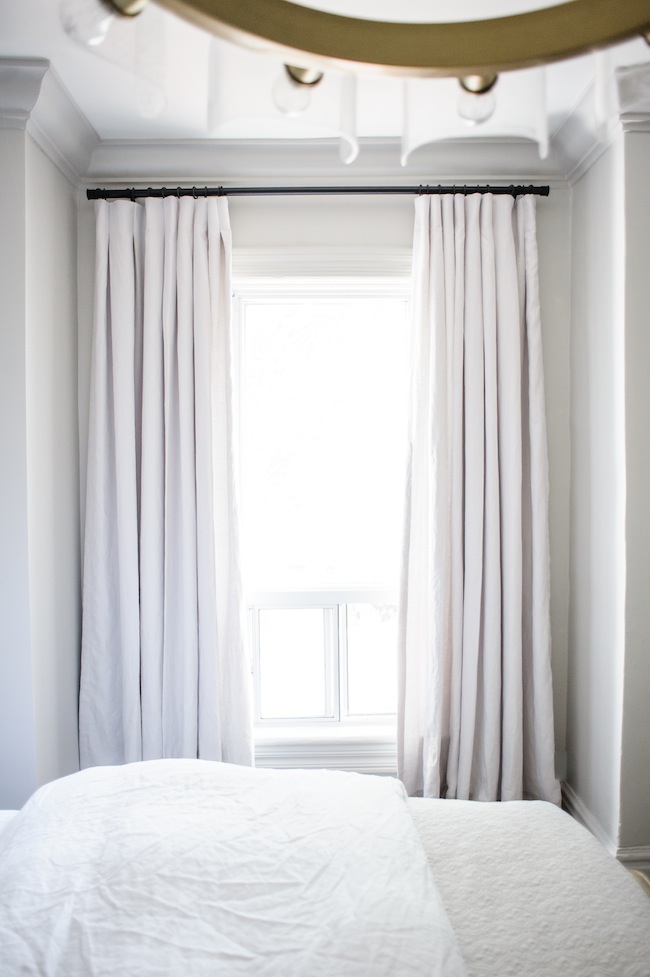 Opposite the new closet wall, you’ll find a single tall and narrow window that we dressed up in custom curtains. The curtains themselves are a beautiful Belgian linen in a heather grey, hung high and wide to make our tiny window look as big as physically possible. The monochromatic palette throughout allows the space to feel quiet, yet sophisticated all at once.