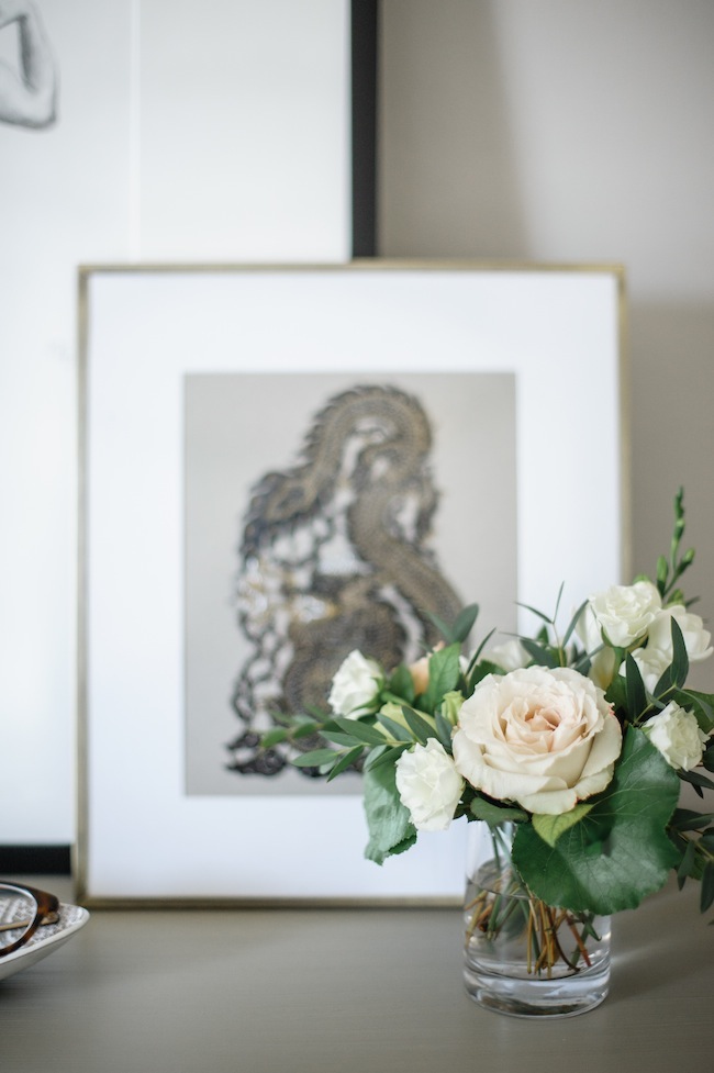 Bonus: it also acts as a pretty spot to hold some of my very favourite possessions. My grandmother’s jewellery, vintage candlesticks, and some of my favourite original art (a piece from my friend Jess drew, which we recently had custom framed here, and a laser cut out we purchased in Thailand) now sit proudly on display.
